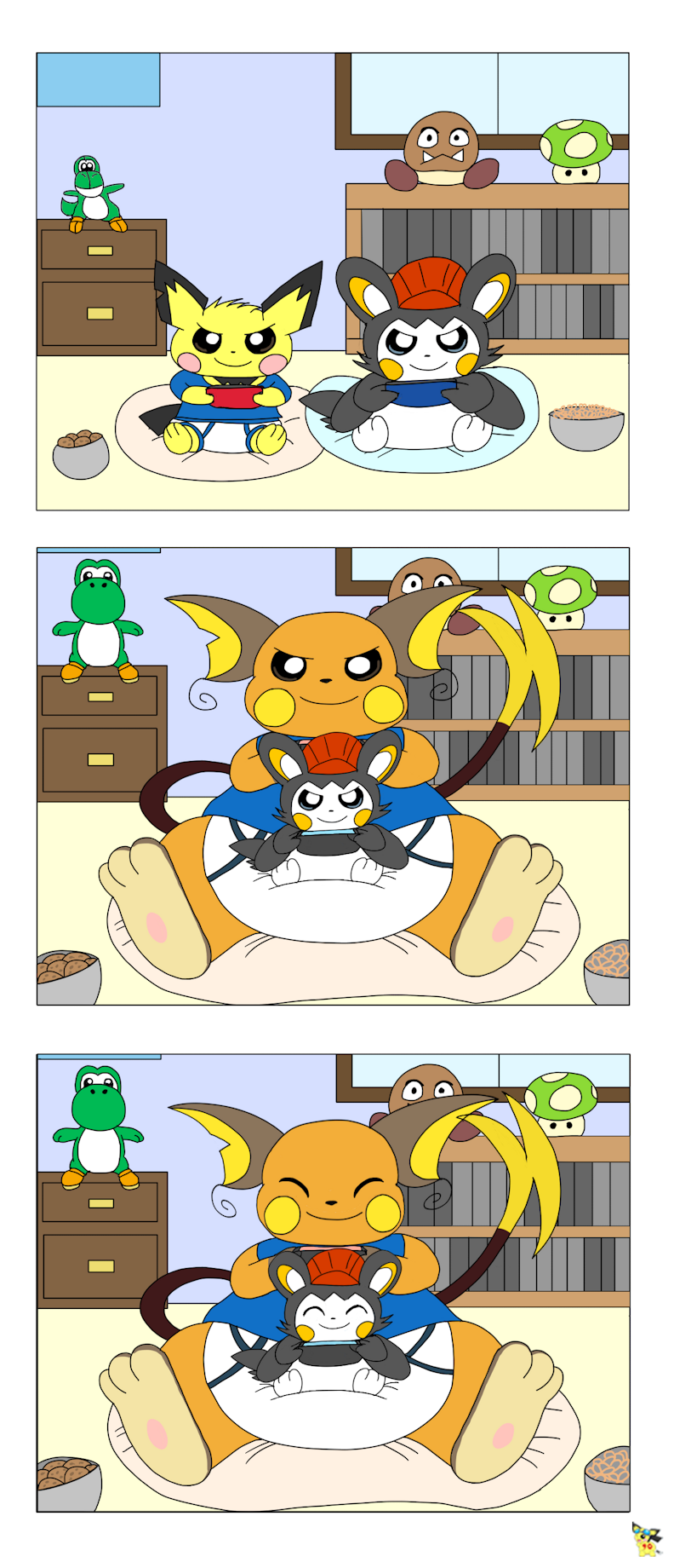 His Skye the Emolga playing the Switch 1 with Chip the Pichu, who evolves into raichu sometime later and are playing the Switch 2 instead. Skye and Chip remain good friends as you can see :3