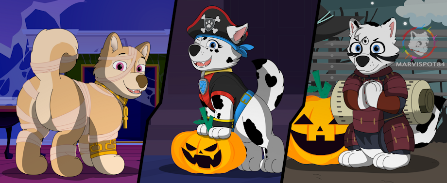 Halloween has begun, and these three pups' costumes look great. Nicky wearing a Mummy costume Stormie wearing a Pirate Captain costume Spots wearing a Hashirama Senju costume