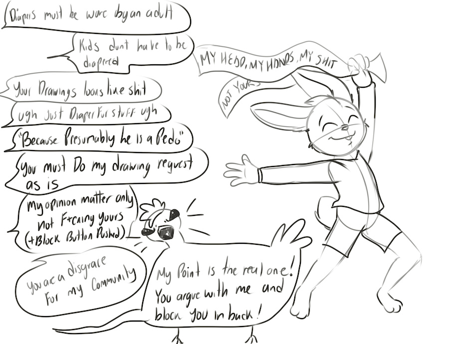 You know what i think from FA in previous drawings and journals, so i dont want to bother with those f-ckers, they think adding an Babyfur individual As staff menber can change what people think in how handle diaper content, which is still a mockery. What it gives me a laugh those who puts "those charaters are +18" and they looks like more childish than mine showing their diaper scenes, just pure hypocrisy in those individuals. Also those who attempts to change my mind in what i draw or what i do with my drawings, many of them previous drawings of human kids in m3ssy or s3xual situations, they think with deleting their old drawings can erase what they do before and for clean their names, they only draw adults in same situations like before, again full hipocrisy, like for example drawing Cream in messy diapers but now they add an chest/boobs and now she is an adult, that just make me laugh so hard. Some of them do that just for their pockets dont be affected and be seen as the good and nice guy who follow cerain community guidelines.