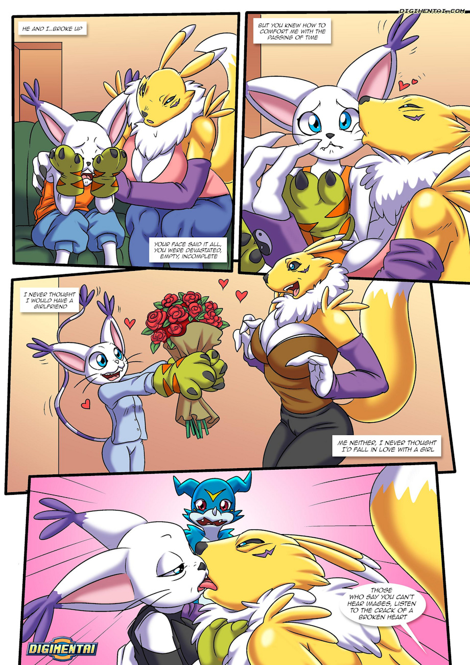 Hey there FLA's! FLA here and today we bring you...a new page from this comic we called Dirty Games 2: The V-irthday, Now is when that beautiful concept of love between two women that we call yuri or in its most general term, lesbianism, appears, after so many pages and so many flashbacks, where we can finally see how GatoRena grew up and how Veemon was relegated to third wheel.