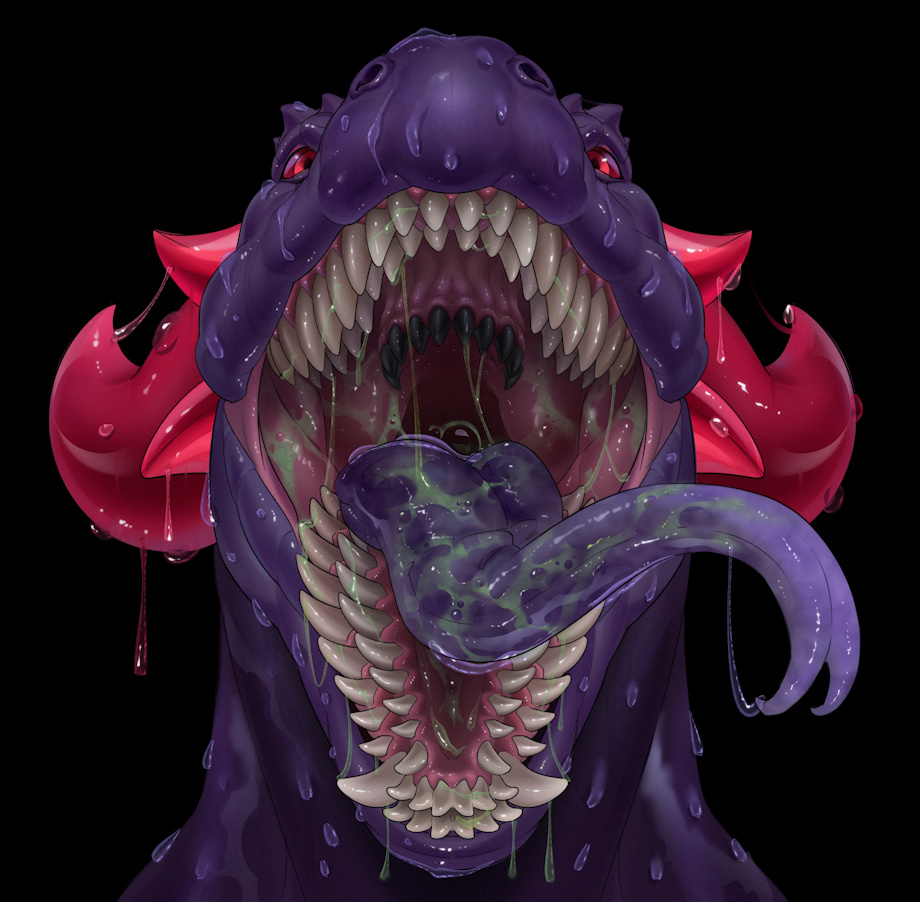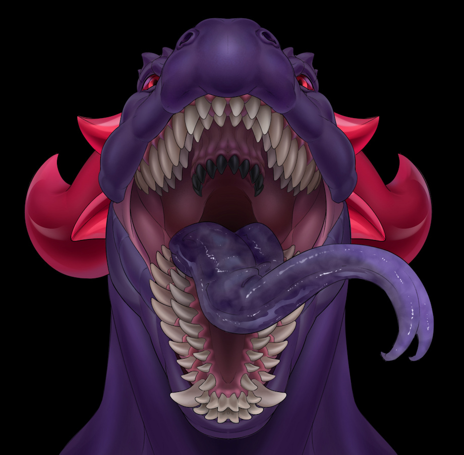 The drippy dragon opened up his jaws right in front of your snout, heavy and foul breath washing over your face as he did so. Dev's throat rippled as it showed you where you'll soon be sliding as you looked at his muscular tongue and the hundreds of fangs~