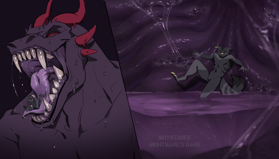 It's not the first time that Ace tried to fight off Dev for one reason or another, and once again he was caught in quite a predicament as he accidentally shrunk himself, and with no weapon and strength he was easy pickings for the gooey dragon. It took him nothing to deposit him on his massive, slimy tongue and even less effort to swallow him down into yet another "demise" in his acrid stomach