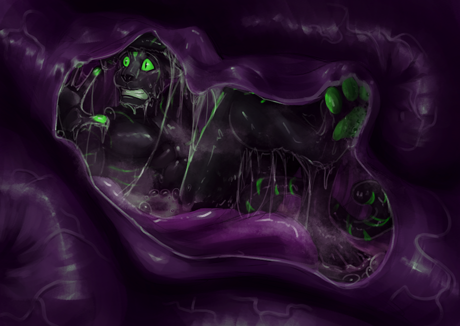 Sprout seems to have ended up in a sticky and tight place within Devourer's digestive system, the slick and slimy walls constantly rippling around his body as the purple organ churns and groans. Not that he seems to mind it much, being a kobold inside of a dragon~