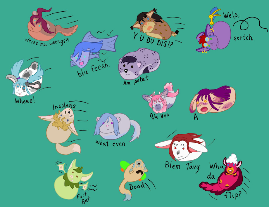 Okay, a lot going on here; I had drawn many of my OCs as potatoes and other silly things for a chuckle during an art block. So naturally I had to go back and color them! Allie, Caity, Erin, Solace, Melody, Tavvy, Ashley, Sonnet, Riley, Tammy, Nectar, Cameron, Anastasia, and Patricia.