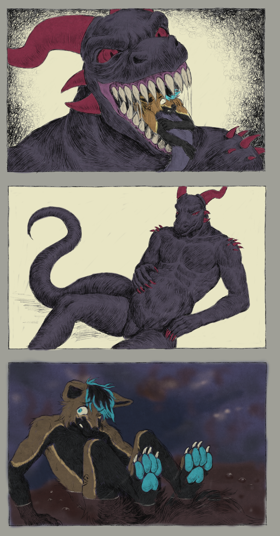 Eating food the normal way gets boring pretty quickly, which is why sometimes Dev likes to play around. Like making a line of preys and keeping them locked with leashes and collars, starting by swallowing one of the ends of it~ At least some of them enjoy it~