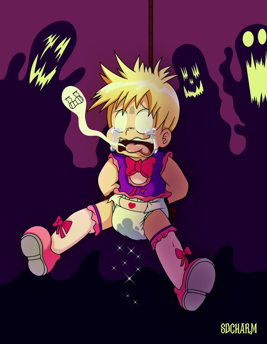 When Chris woke up, he was dressed in a sissy butler outfit complete with a diaper. He was confused and scared, dangling from the ceiling by the rope, only to then notice that the shrouds of darkness around him were rising up, calling his name, and claiming they were going to eat his soul!