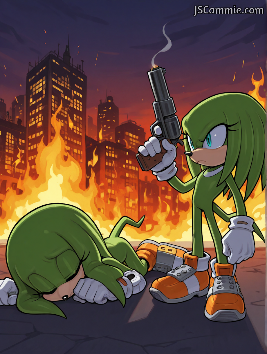 Ch. 23 (two images) - Ultimately, Mephiles succeeds in his plans. Sonic is killed, Solaris is formed, and everyone ends up in a stage called "End Of The World." While Sonic's friends seek the Chaos Emeralds to revive him, our cast of characters hunt down the Time Stones to break free of "End Of The World." Punchy searches Eggman Nega's base in Dusty Desert, while Guard returns to Outpost Fiery Red, which is now infested with arachnid Lospides.