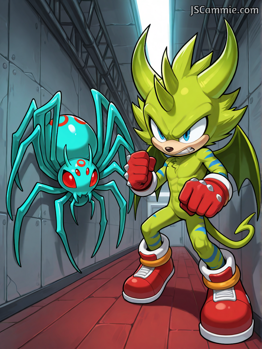 Ch. 23 (two images) - Ultimately, Mephiles succeeds in his plans. Sonic is killed, Solaris is formed, and everyone ends up in a stage called "End Of The World." While Sonic's friends seek the Chaos Emeralds to revive him, our cast of characters hunt down the Time Stones to break free of "End Of The World." Punchy searches Eggman Nega's base in Dusty Desert, while Guard returns to Outpost Fiery Red, which is now infested with arachnid Lospides.