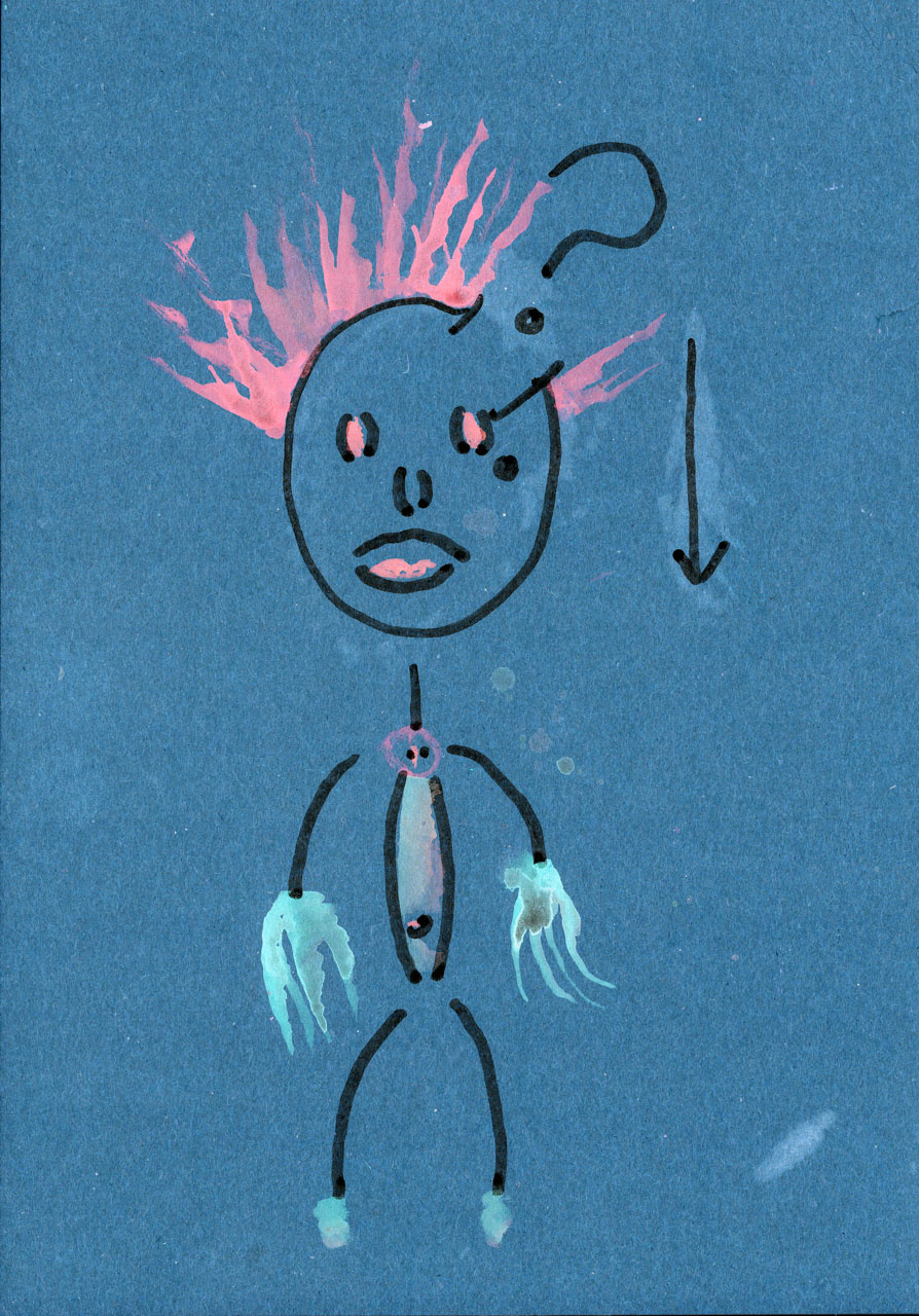 Alt text: A stick figure in black against mid-blue, pink hair, eyes, mouth, blue feet, hands, and tum. There is a gap in its head for the ? to get out, and a down arrow beside.