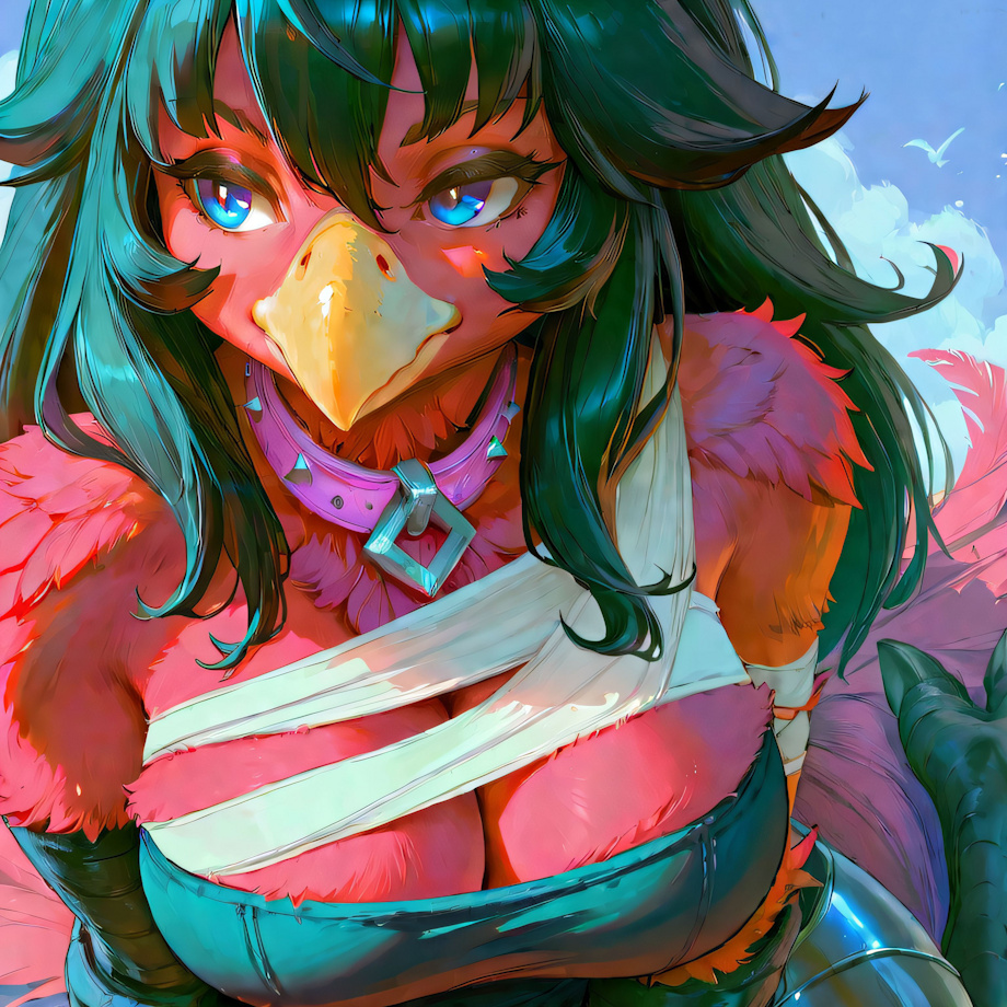masterpiece, high quality, detailed fur, high detail, 4k, detailed background (1girl, closeup, face focus, solo, black chest wrap, clothed:1.4) <lora:(1) FenrisXL Lighting:1> <lora:(1) Mjölnir (SDXL Lighting):1> <lora:photorealistic anthro 2:1> furry <f1g5> (female:anthro:slender:voluptuous:chocobo:1.4), (long hair, messy bangs, black hair:1.4), (red feathers:1.7), (yellow beak:1.3), (blue eyes, black pupils:1.3), (digitigrade:1.2), (black forearms, black hands, black feet, black shins, black ankles, scuted legs, talons, scuted arms:1.4), (large breasts:1.3), (pink collar:1.3), (tail feathers:1.3), (clothes:2) Negative prompt: bloodshot eyes, arms behind back, hands behind back, blurry, blurry background, bad anatomy, bad hands, three hands, three legs, bad arms, missing legs, missing arms, poorly drawn face, bad face, fused face, cloned face, worst face, three crus, extra crus, fused crus, worst feet, three feet, fused feet, fused thigh, three thigh, fused thigh, extra thigh, worst thigh, missing fingers, extra fingers, ugly fingers, long fingers, horn, realistic photo, extra eyes, huge eyes, 2girl, amputation, disconnected limbs, worst quality, normal quality, low quality, low res, blurry, text, watermark, logo, banner, extra digits, cropped, jpeg artifacts, signature, username, error, sketch ,duplicate, ugly, monochrome, horror, geometry, mutation, disgusting, jpeg artifacts, , NEGATIVE_HANDS ac_neg2 p0rnXL-neg DeepNegative_xl_v1 BeyondV3-neg, (nipples, nude, nudity:2) (erect nipples:2) (topless:2) Steps: 30, Sampler: DDIM, Schedule type: SGM Uniform, CFG scale: 5, Seed: 3850638194, Size: 512x512, Model hash: 171e88f0da, Model: yiffymix_v62Noobxl, Denoising strength: 0.25, ADetailer model 2nd: face_yolov8s.pt, ADetailer confidence 2nd: 0.3, ADetailer dilate erode 2nd: 4, ADetailer mask blur 2nd: 4, ADetailer denoising strength 2nd: 0.4, ADetailer inpaint only masked 2nd: True, ADetailer inpaint padding 2nd: 32, ADetailer version: 25.3.0, Hires upscale: 1.5, Hires steps: 20, Hires upscaler: 4xUltrasharp_4xUltrasharpV10.pth, Lora hashes: "(1) FenrisXL Lighting: c49df8024095, (1) Mjölnir (SDXL Lighting): 368d428918ac, photorealistic anthro 2: bed53d4c8b68", TI: "NEGATIVE_HANDS, ac_neg2, p0rnXL-neg, DeepNegative_xl_v1, NEGATIVE_HANDS, ac_neg2, p0rnXL-neg, DeepNegative_xl_v1", Version: f2.0.1v1.10.1-previous-224-g90019688 |