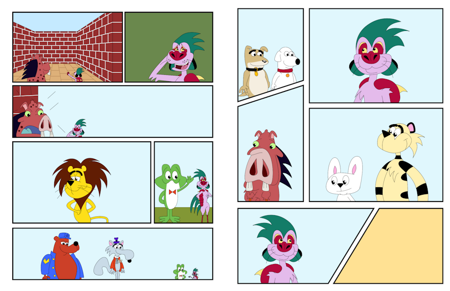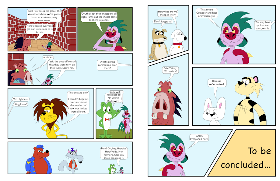A vector comic to fit in with today’s Inktober 2025 prompt, vacant, featuring Armadillamingkat “Armie” Berkowitz, Warratduck “Rat” Smith, Linus the Lionhearted, Hoppity Hooper, Waldo Wigglesworth, Fillmore the Bear, Brian and Vinny from Family Guy, Crusader Rabbit and Rags the Tiger.