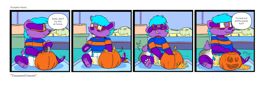 Illustration of Friar the wet and messy diapered lion seated in an unsnapped pumpkin onesie while wearing a pumpkin bonnet.