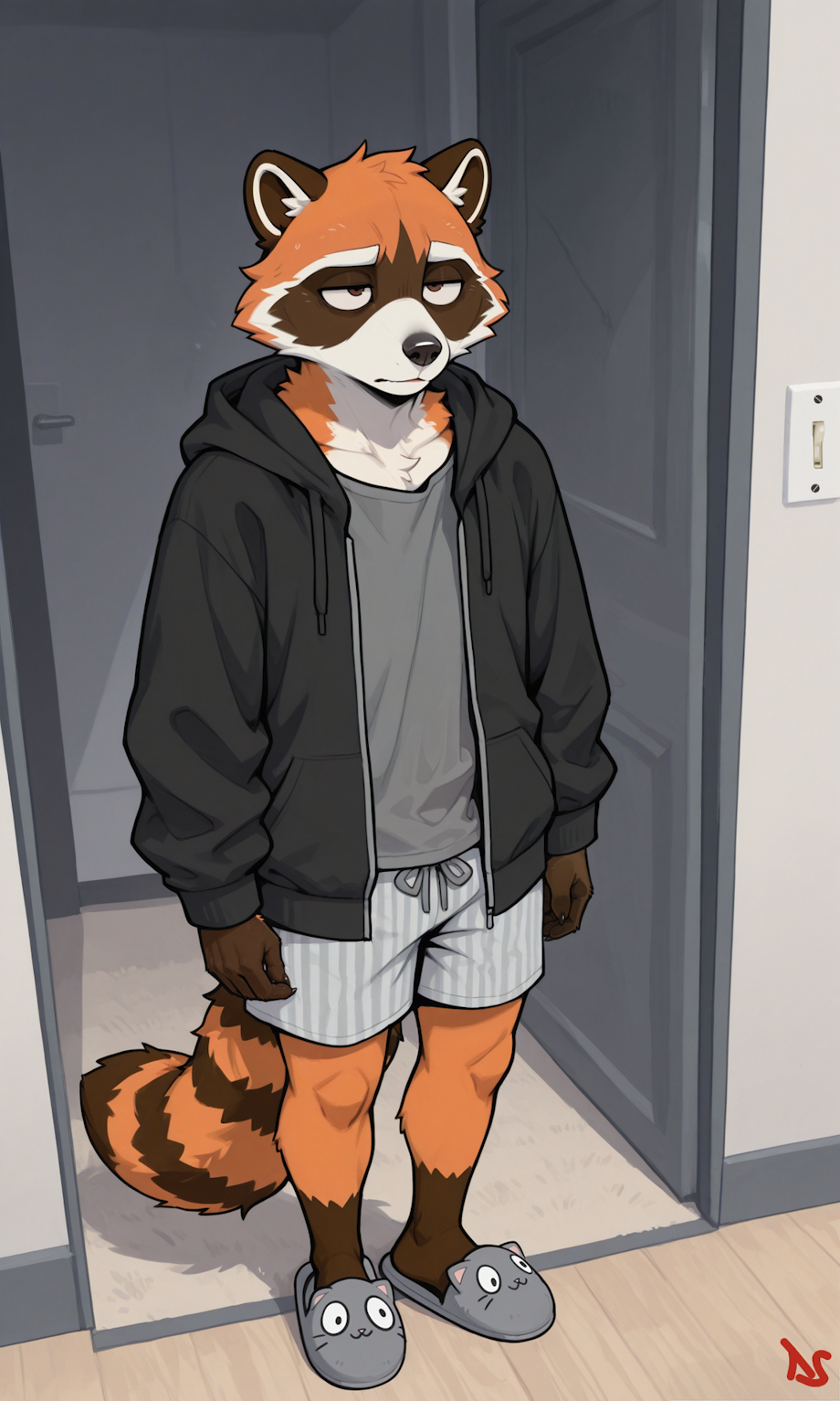Prompt: gray cat slippers, anthro raccoon boy, orange fur, tired eyes, gray shirt, black hoodie,