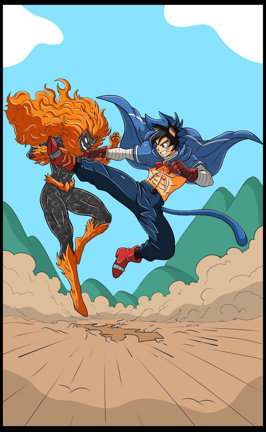 The moment their eyes met, the fight erupted — Bluerush’s kinetic bursts slicing through waves of demon fire. Every punch sent shockwaves through the streets, and every fire blast melted more of the city’s concrete. But amid the chaos, Dr. Flame — stubborn, proud, and (figurative and literally) hot-headed — finally noticed the damage they were causing. The cracked buildings. The terrified onlookers.