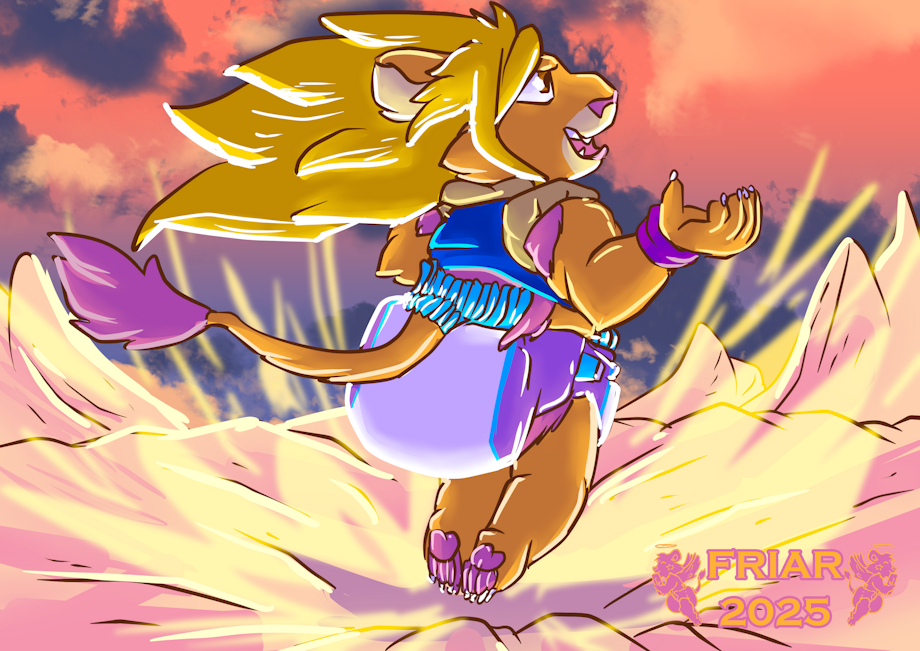 Illustration of SSJ3 Friar the wet and messy diapered lion powering up, pooping his diaper, and floating above a crater in the ground in a DBZ desert battle arena. "I haven't even begun to *fully* use my diaper power!"