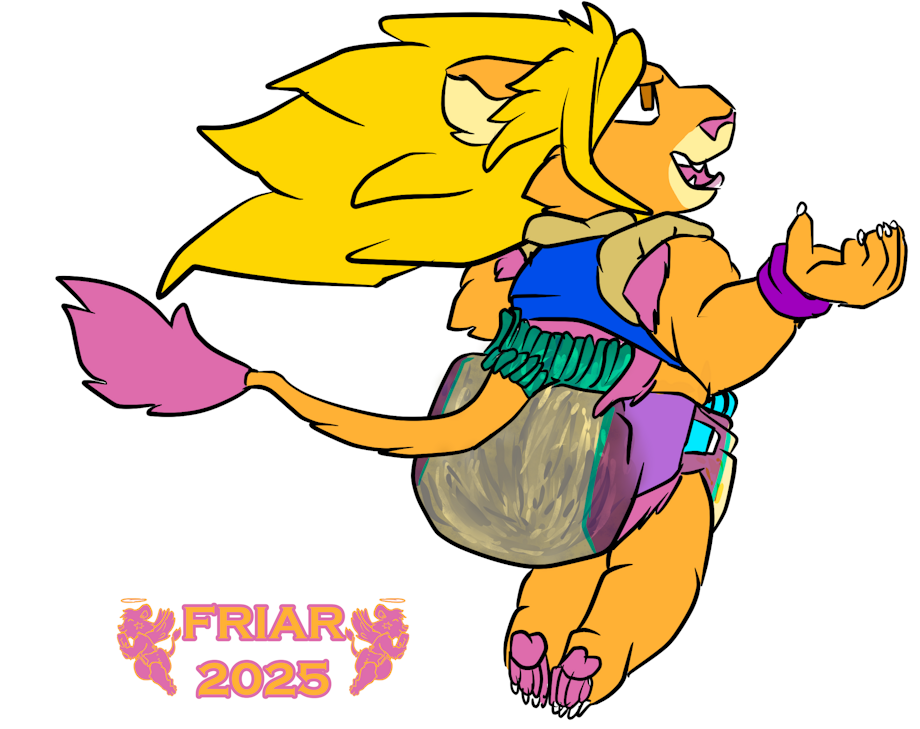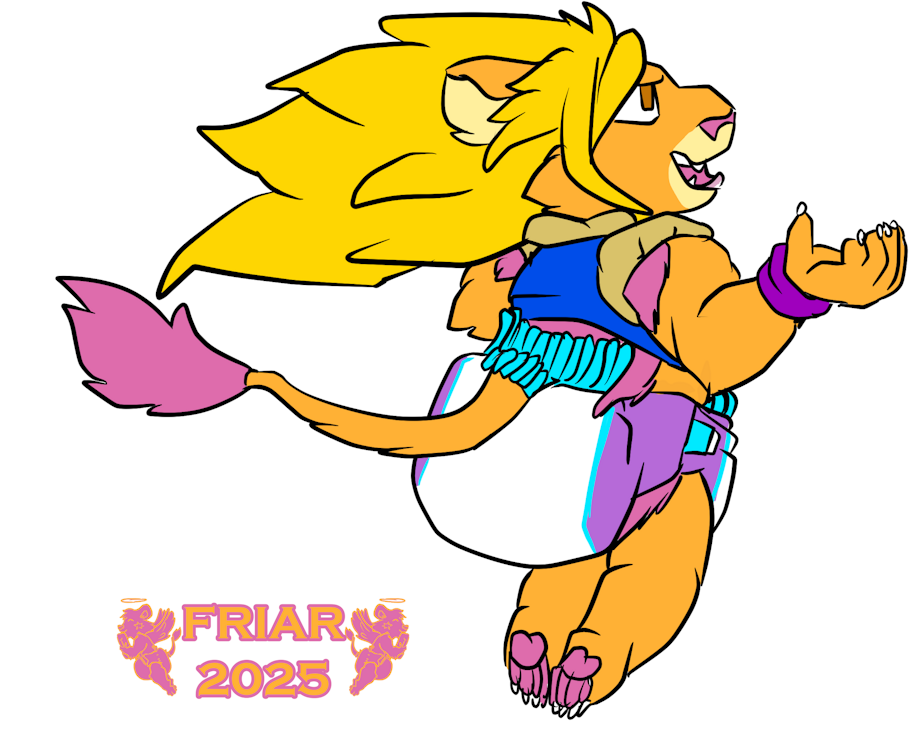 Illustration of SSJ3 Friar the wet and messy diapered lion powering up, pooping his diaper, and floating above a crater in the ground in a DBZ desert battle arena. "I haven't even begun to *fully* use my diaper power!"