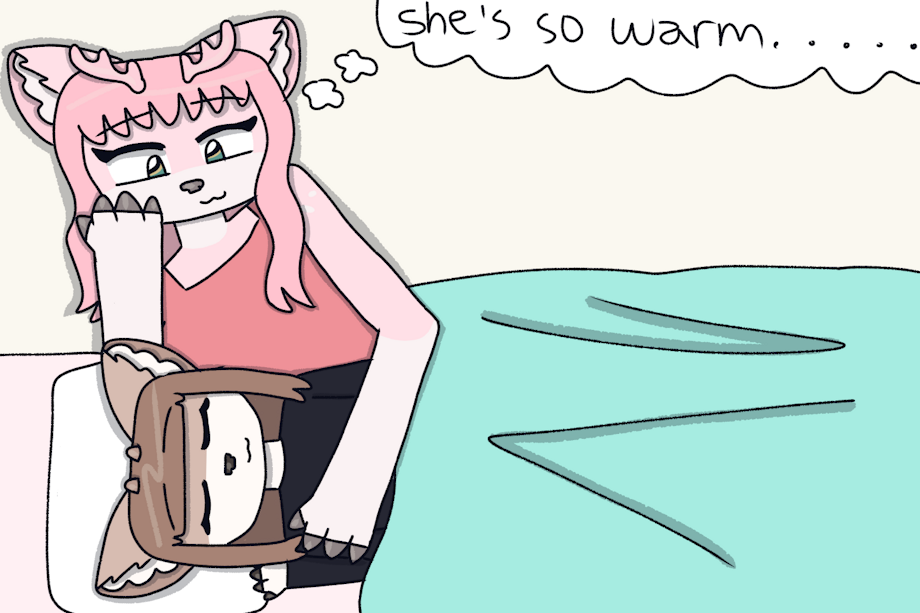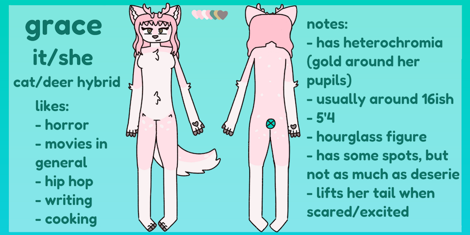soft, somewhat fluffy, pink fur with lighter pink countershading and spots. has small antlers. wavy/curly pink hair. blue-green eyes with gold around her pupils. gray nose and hoofpaws