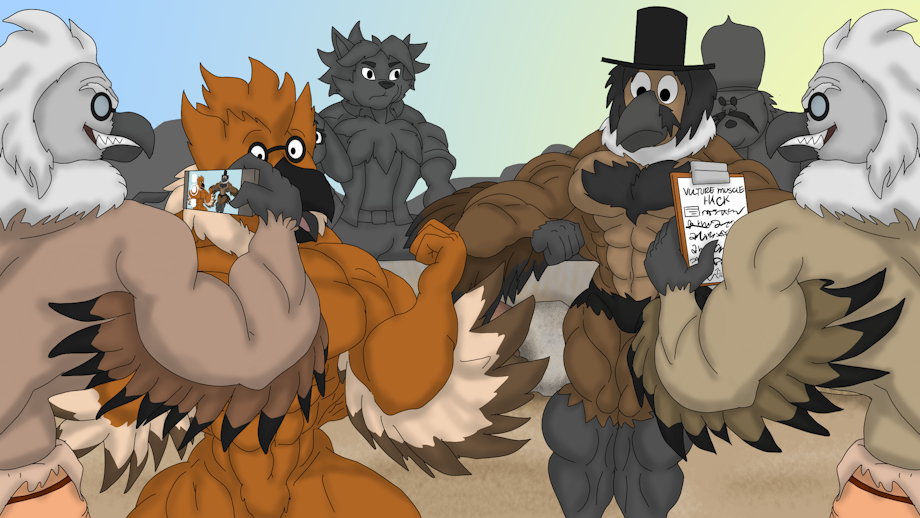 Here's a 2-part transformation + muscle growth artwork, made as my part of an art trade between me and TarahjiCheatham, where both Ralph the All-Purpose Animal (left) and Mumford (right) are injected and transformed into muscular vultures, as an experiment orchestrated by Synonymess Botch.