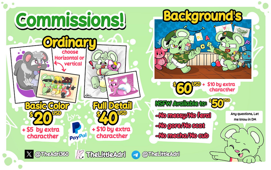 Hello everyone, we have open commissions. For those interested, contact me via X or Telegram, I will be responding ^-^