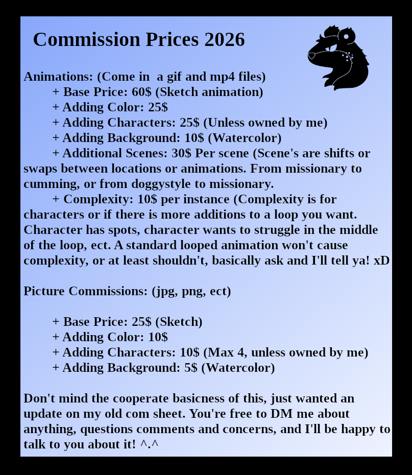 Hey ya, sorry I haven't updated my prices in a while, posting this now so I can have it done finally. Sorry if this is not flashy or as high-tier as other artists, especially for my watcher level. But I'm very happy to work with anyone, and I try to be very quick and efficient with all my work.