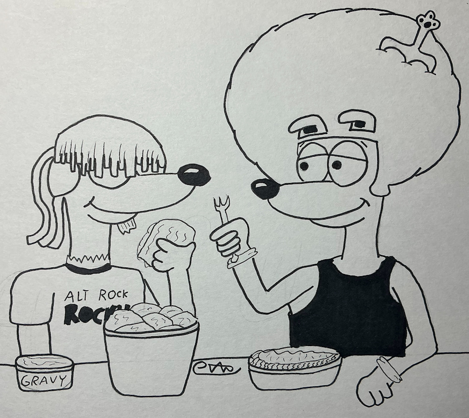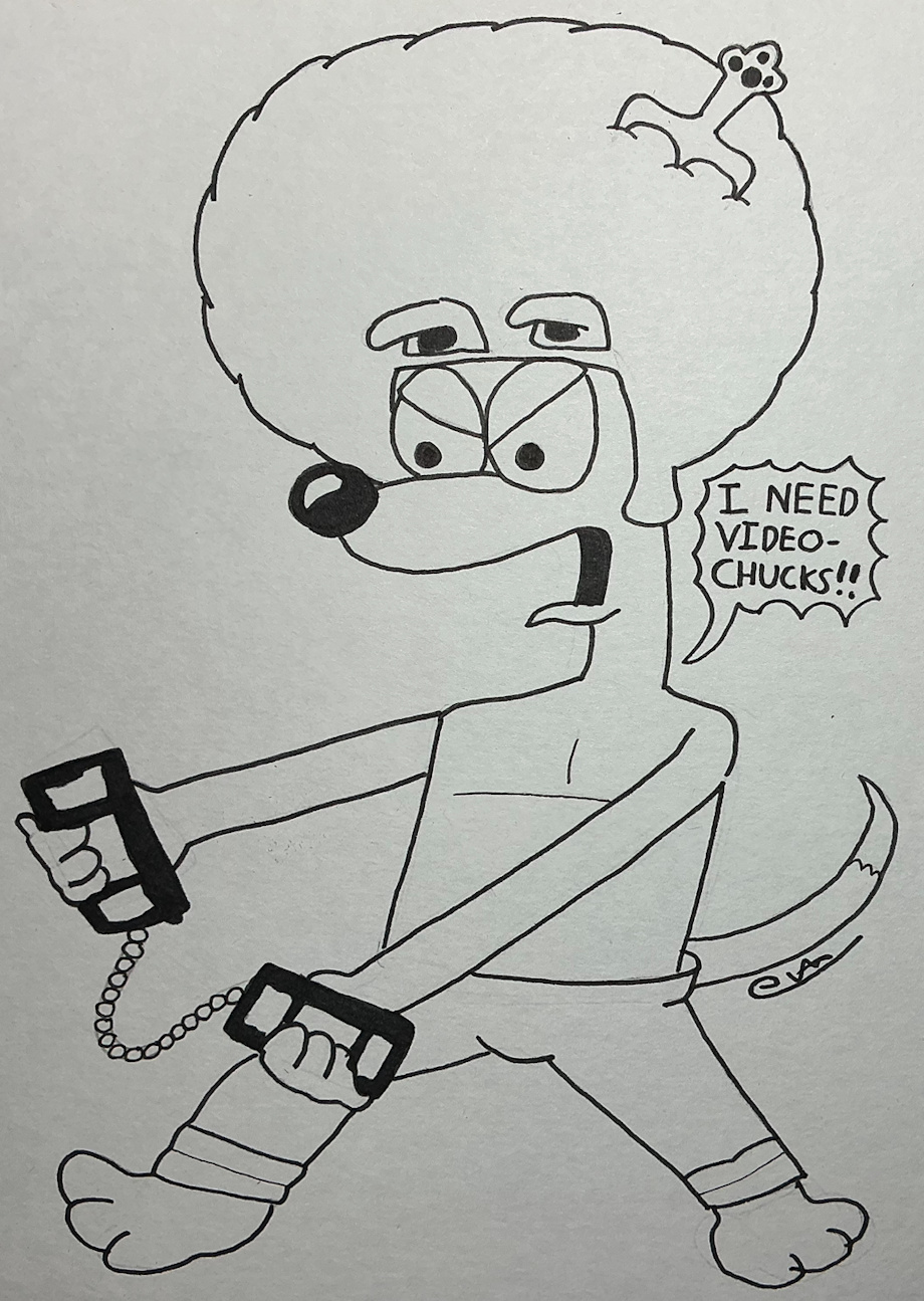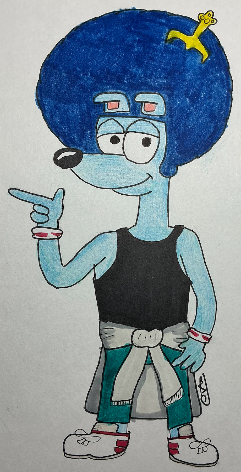 He now wears his silver jacket tied around his waist, and he wears a black sleeveless shirt. Plus, he wears white wristbands.