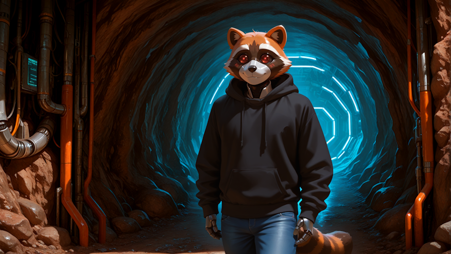 Prompt: raccoon boy android, orange fur, 1boy, black hoodie, blue jeans, robot eyes, robot anthro, photorealistic, underground, male focus,