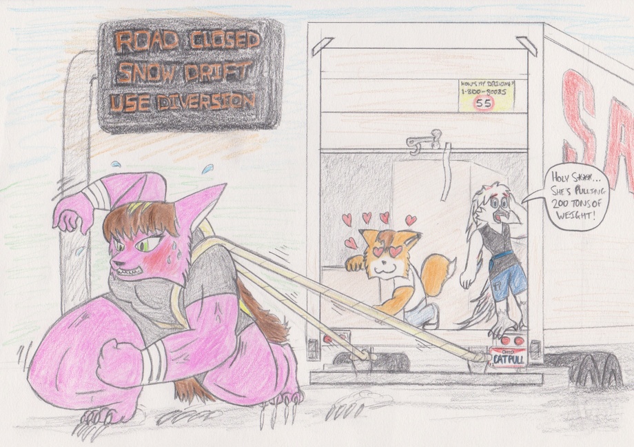 Sasha was having some stuff delivered to her restaurant when she found out the delivery truck had got stuck in a snow drift. She found out where it was and using her almighty strength, starts to pull it free, much to the amazement of Mr Auroros and the pleasure of myself!