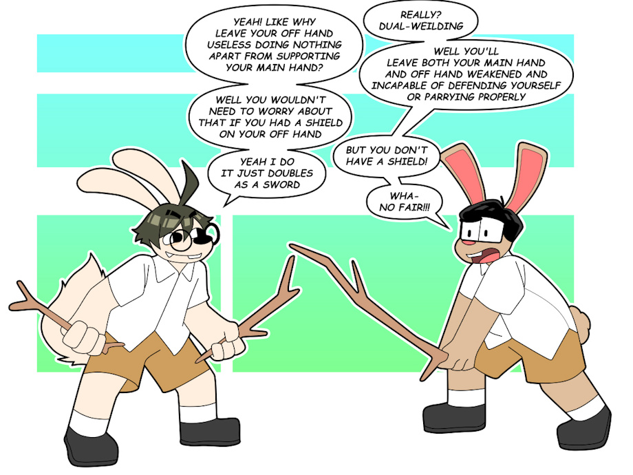 The fun thing about both wolf and bun bf is we got that very painfully shared experience of being the outcasted weirdo of the class. The Nerds Autists Or maybe locally even Abnormal which is kind of an insult here in the same vein as calling somebody autistic Having somebody to match your weirdo energy online and now irl for me has been beyond fun Like sword fighting with an old rusty katana you somehow found in the backyard fun... or shooting random shit with an airsoft gun fun... while the two of you talk of different kinds of guns and swords in history and talk about how you can absolutely totally do martial arts (no really watch me (flails around like an idiot)) kinda fun