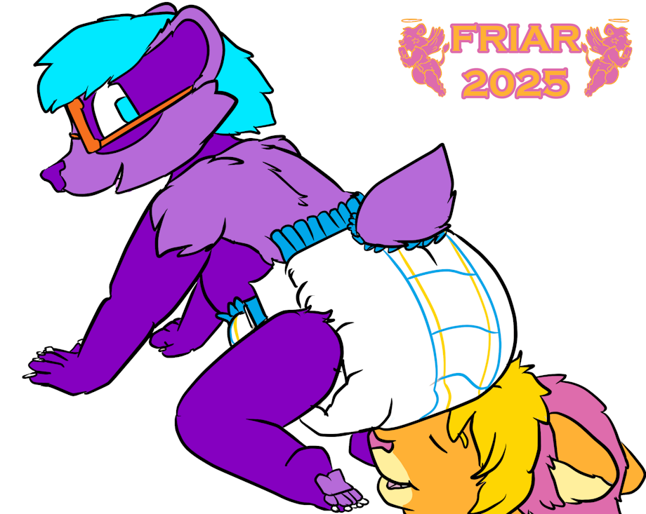 Illustration of Everett the wet and messy diapered badger pooping his diaper on Friar the lion's snoot, who is checking his diaper. "Wanna check my diaper for big poopies?" "I don't mind!"