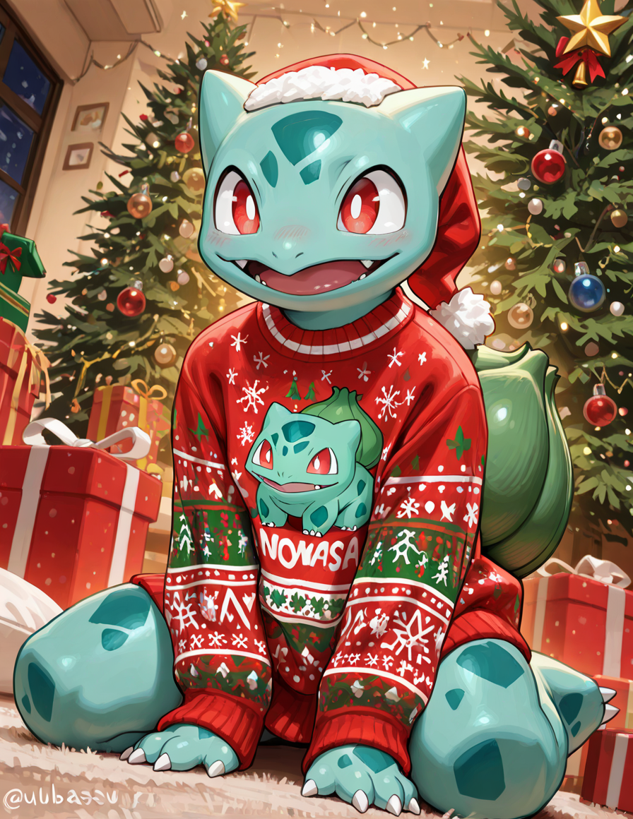 masterpiece, best quality, amazing quality, christmas theme, christmas tree, christmas present, christmas sweater, anthro, bulbasaur