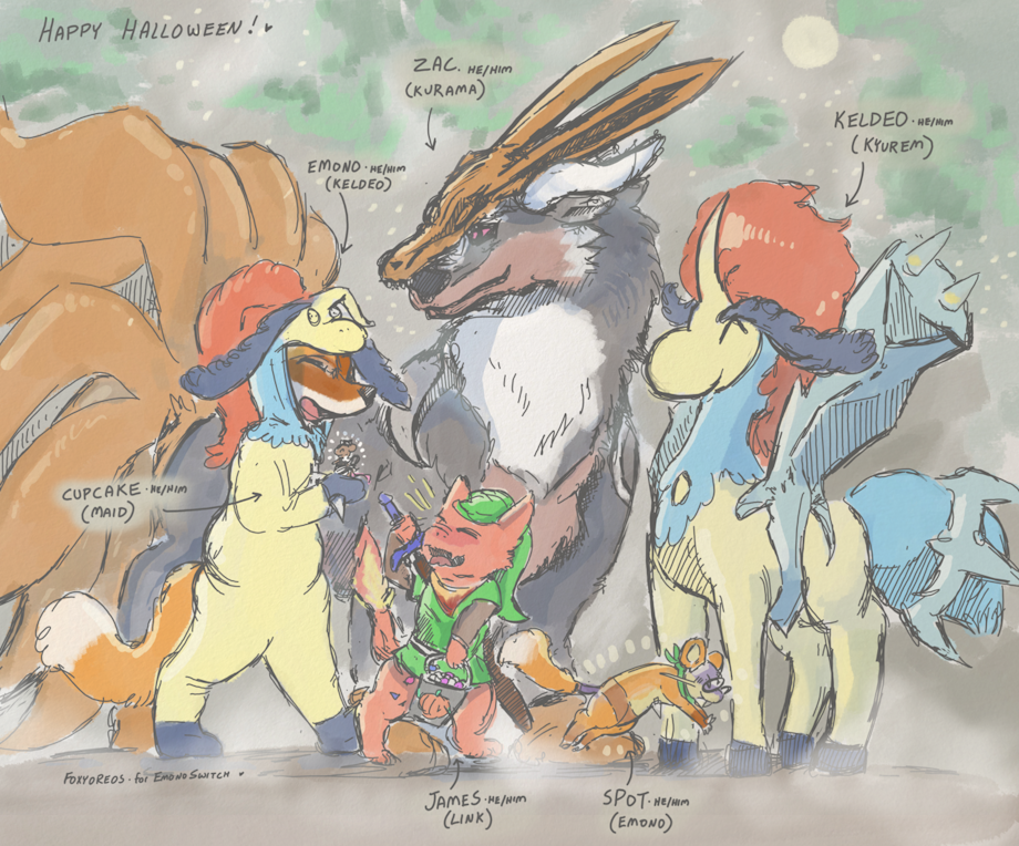 Emono commissioned a whole bunch of doodles/sketches during a recent Halloween stream! Here's him and a bunch of friends (including Cupcake :3) going trick or treating :3c