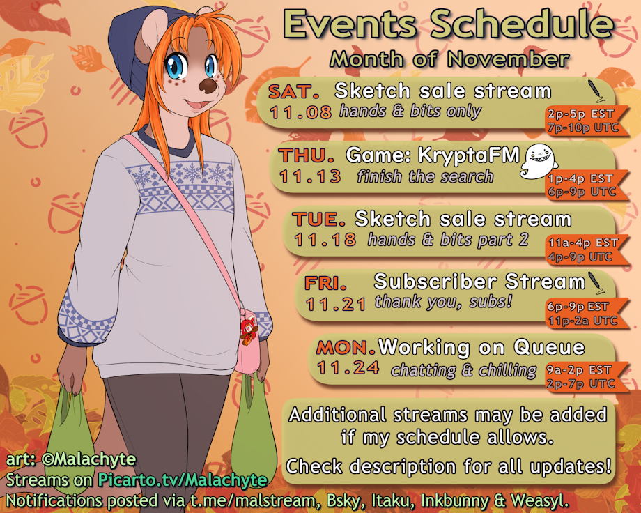 New schedule! I've been keeping busy with work and getting ready for soup season. You can also find my schedule, as well as receive notifications that I'm streaming, on my Telegram broadcast channel. And if you check out my Website, you can find my schedule as well as info about the current commission style I'm offering.