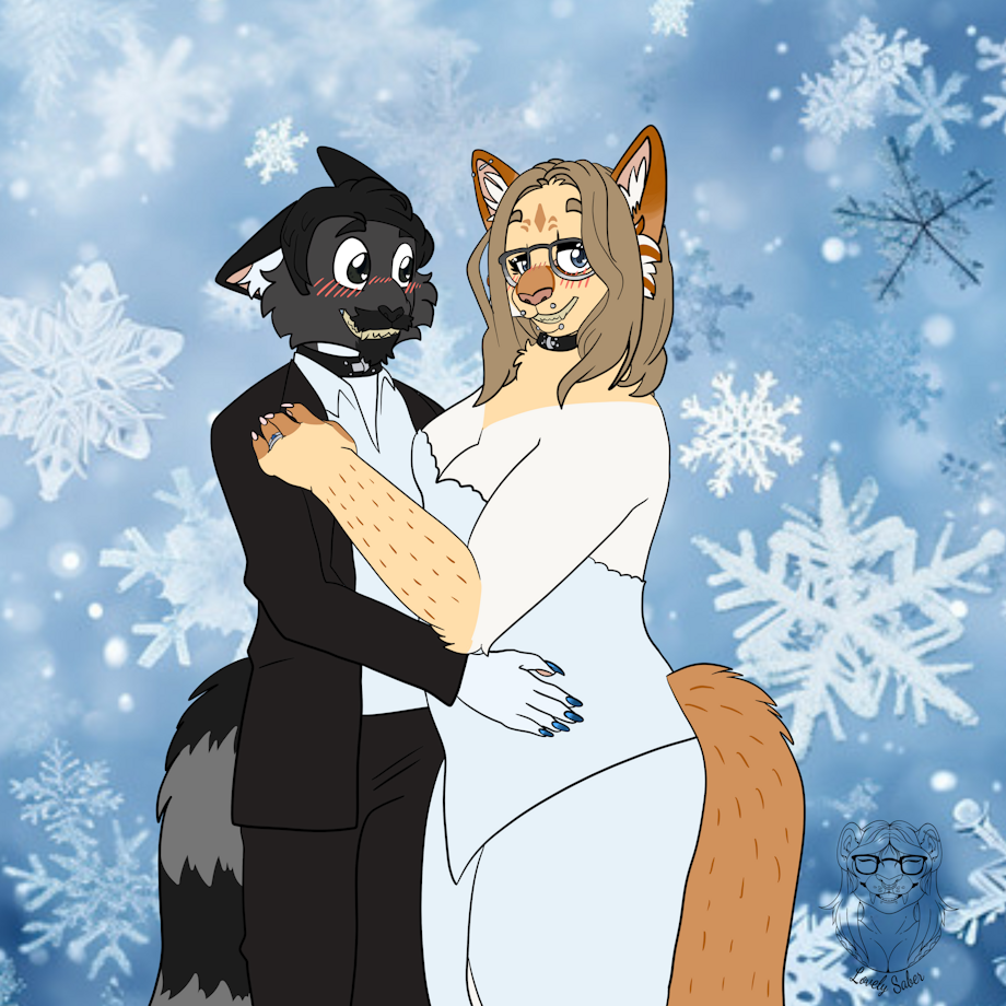 me and my fiance are due to get married hopefully next Feb 14th! so I drew us all dressed up in wedding clothes