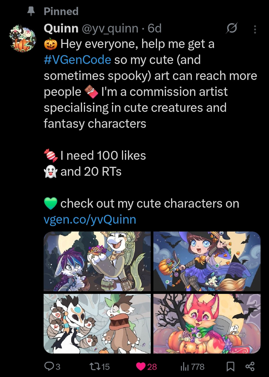 I'm trying to get on this art site, vGen, but it is invites-only for artists, and you gotta apply for a code... but to apply I need 100 likes and 20 retweets on x/twitter , but getting any sort of engagement there is WILD 💀 So if any of you can help with a like and a retweet, pls do, I need to expand my reach and diversify, like I used to before when I was also on deviantArt. Trying to get that one up again as well,, and there are still active ppl there that have blocked the ai 👌 but I also het 1 scam message per week 😆