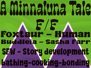 Once the human's long ginger hair had been thoroughly lathered up, the purple and white vixen-taur rubbed the bar of soap between her paws and started gently running her soapy paws along Sasha's skin. From the sides of her neck across the tops of her shoulders, down her arms, back up and then down along the human's sides and back. Every now and then Sasha could feel how Buddleia was running one finger over her skin here and there.