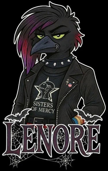 Lenore is a raven, and one of the goth-punk variety. Pretty much me. No, really, she is basically me with feathers and a beak. I haven't even changed her clothing or hair style from mine. If you know me in real life (which, given my hesitation in socialising in furry circles, is very unlikely unless it was a long long time ago), you will definitely recognise this dumb nerd as me.