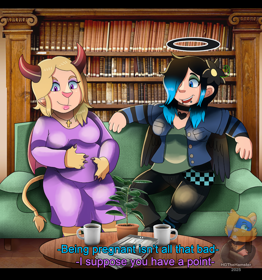 With that out of the way... this is kind of a scene remake of a drawing I made all the way back in 2014 where Lily was pregnant and Emo decided to chat along helping her out with it. Of course the older drawing was a bit outlandish with Lily being rude to Emo. So in the remake I decided to make Emo more encouraging. The whole reason I decided to draw this was mostly just because I have been thinking about these two the past few days and how they don't get much interaction in the webcomic despite being close friends. I just decided to depict it here with an interaction they most definitely had in the past. I do also want to write this as a story in the future- and when I do I will update this desc with a link from my AO3 account.