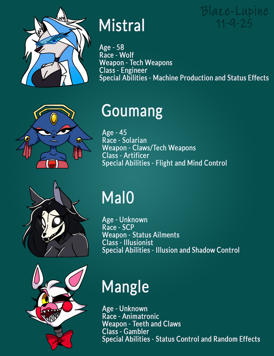 These four I'd consider the "support and chaotic" members of the group. They excel at helping others perform better, or resulting in status or crazy effects on the enemy. Especially Mangle.