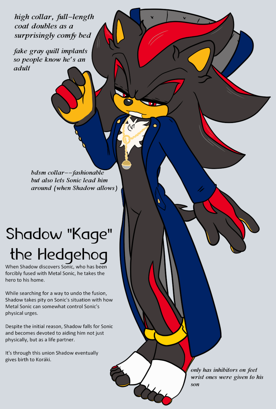To help control his Black Arms mutation, Shadow gave Koráki the inhibitors from his wrists, engaging in more relaxing activities to keep his energy from going wild. He is surprisingly submissive, as evidenced by the bedazzled day collar around his neck, and uses the huge collar as a pillow for quick naps whenever he's in the mood for one. The white half-socks around his feet aren't just comfortable, but useful for helping Sonic when needed. As for why there's a white stripe down his chin, it's also for a naughtier reason~