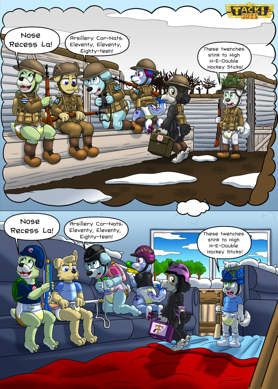 A group of particularly imaginative babyfurs and littlefurs heard some stories from Gramps about the upcoming Veteran’s Day/Armistice Day. Now with Gramps asleep, it’s time to play World War I!