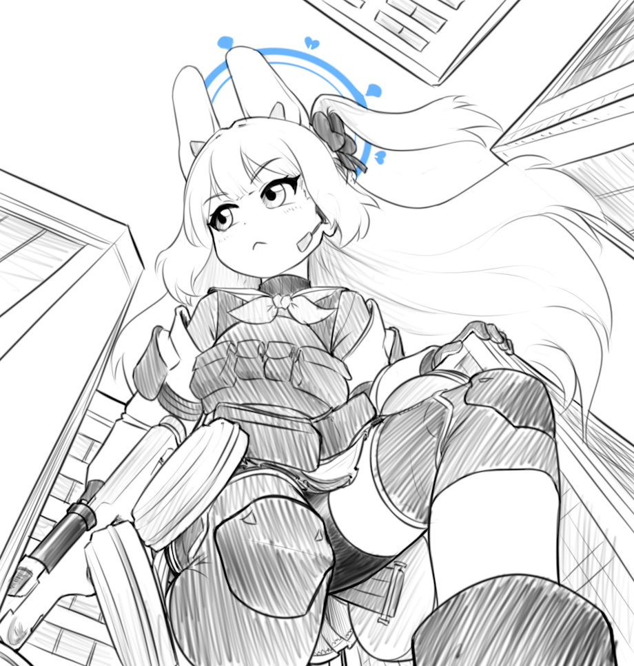 Her hair blowing in the wind as she turns her head is illustrated so well too! Love the look on her face, taking the operation seriously! Phenomenal work on the many details of her outfit, you're amazing at capturing the unique schoolgirl + tacticool aesthetic and keeping the appeals of both sides. Even really tricky aspects like drawing her kneepads at such angles as well as representing the spare drums around her legs is done impressively! Same with how her pouches and skirt work with her posing. Her gun looks nice too! Despite it being your first time drawing the character, working in POV with a difficult pose at that, you absolutely knocked it out of the park. Cute spats as well! I hadn't even thought about her wearing them before but honestly it's a very appealing and sensible concept, I approve.