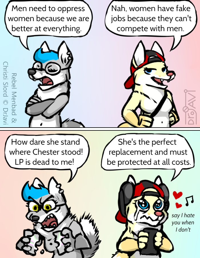 I'll be happy to explain: Chester Bennington, who was the lead vocalist of Linkin Park (LP), died in 2017. Emily Armstrong took his place in the band in 2024. This comic references two people I personally know: a feminist who viewed said replacement as negative, and a misogynist who saw it as positive. I found that disonance amusing. And that's it. There was never any politics in this picture.