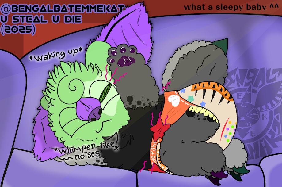 Every time I wake up I'm always making noises that are similar to whimpering, you can call it weird, but since I make these noises in my bed I suddenly thought to try drawing Bengal doing them too.