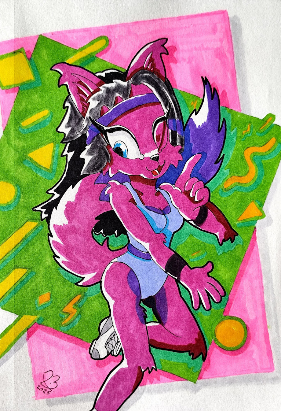 Besro the bright red rabbit, sits on a curb looking up sternly to the left of the viewer. Besro has blonde hair, eyebrows and a tail. He's got Green eyes and a pink nose. He's wearing his usual - a gray T-shirt with a bright blue sleeveless vest on over it. Under it, is green shorts and blue tennis shoes. He's got his arms lightly crossed as he sits on a narrow sidewalk in a back alley. Behind him is an old warehouse wall made of dark red bricks..Moss and other green things are seen growing in the cement cracks. A old window can be seen just off the top left edge of the frame.