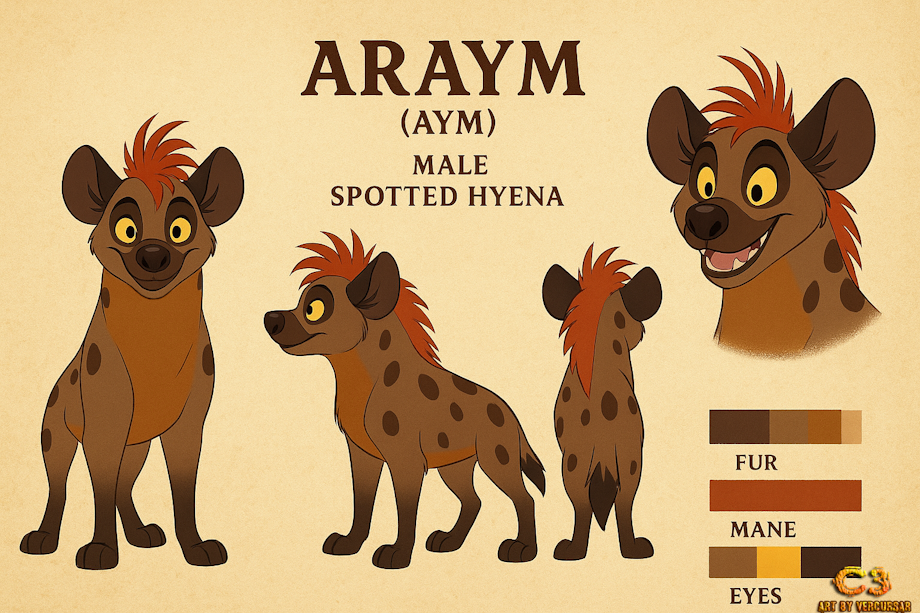 Araym is a playful and eccentric hyena. He lived in a territory with his parents and siblings. Eventually, their territory was invaded by other hyenas who wanted to claim it as their own. Fights broke out, and many died. When the hyenas turned on Araym, his brother intervened to protect him, allowing Araym to escape, but his brother was killed in the process.
