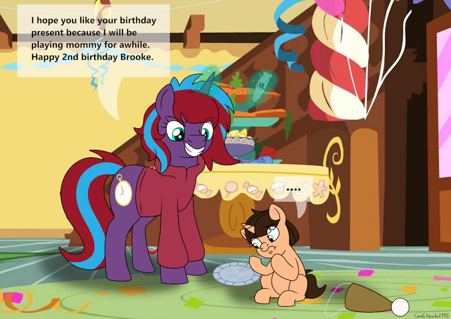 Small Brooke had a birthday party on her birthday and Charming Dazz of course was there, but she had something sinister planned. That plan was tainting Brooke's cake with one of her potions so that she could be her little foal for a certain amount of time.
