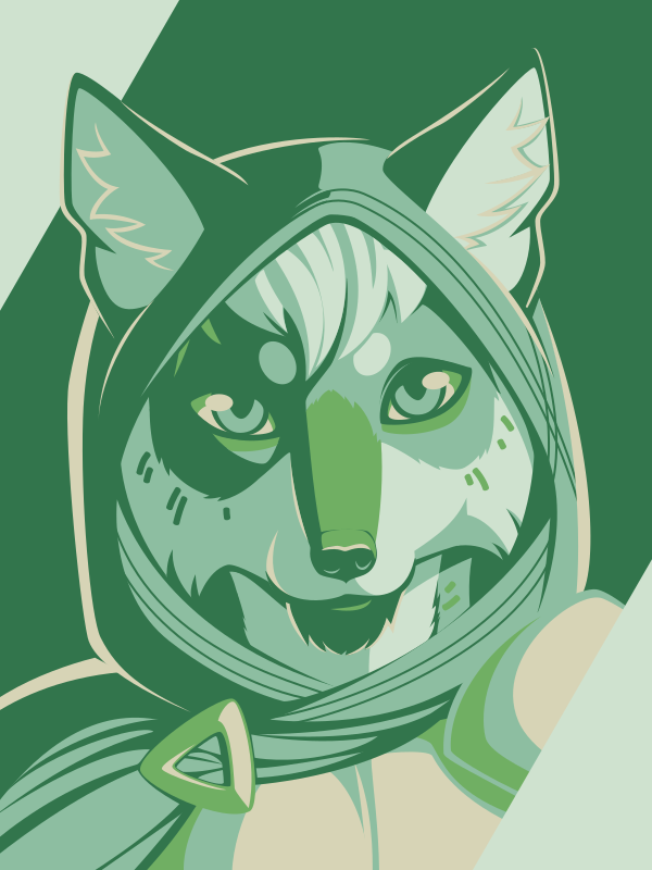 [A vector portrait of an anthro coyote wearing a hood and armor, drawn in flat colors: light yellow, light blue-green, medium blue-green, medium green, and dark green]