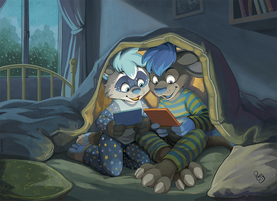 Rien the raccoon and Sebastian the kangaroo are having a sleepover during a rainy evening, outside the sound of the storm becoming the background music for their video game marathon.