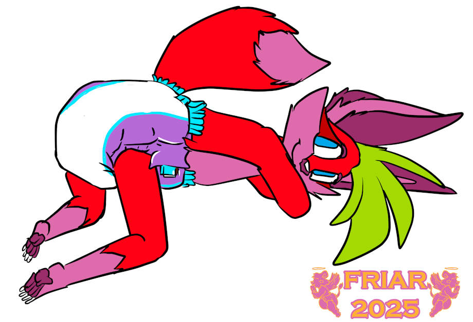 Illustration of Berry the wet and messy diapered fox posing cutely on his bed, looking back at the viewer with his tail up as he fills his diaper.