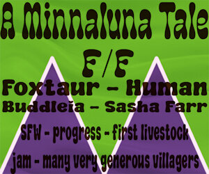 Sasha had noticed the changes in herself and Buddleia as well, and from all their time spent together cuddling and relaxing between and after the work they were doing, Sasha had also noticed that while Buddleia's speech pattern had improved now that she had Sasha to have actual conversation with, it was still a somewhat broken speech. At first the human woman had thought the vixen-taur was speaking the way she did on purpose, for endearing effect or because she simply had no further drive to improve it. But all the time they spent just laying together in the grass, cuddling, relaxing, brushing each other's hair and fur after bathing, had gradually made Sasha realize there was more to it. The fact that the purple and white vixen was a taur seemed to have retained a few somewhat more strong animalistic capacities inside of her. Sasha had seen Buddleia sometimes chasing after wild rabbits purely for entertainment, the vixen-taur wagged her tail, and some of the most clear indications were the way she chortled and giggled in short, staccato yips and even more so the affectionate licks she gave Sasha whenever they were cuddling or just simply relaxing, and the soft, content and happy whines she let out when they cuddled and petted one another or when Sasha was brushing her fur. And it apparently had an effect on her speech pattern as well. But it was indeed very endearing, and Sasha loved each and every one of the little quirks as it made Buddleia the sweet, special and unique vixen-taur that she was.
